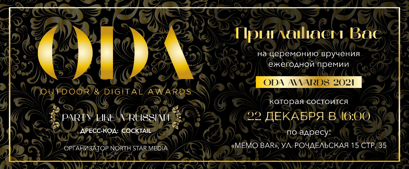 Компания North Star Media совместно с ведущими экспертами рекламного рынка 22 декабря подведёт итоги уходящего года на ежегодной премии ODA Outdoor&Digital Awards. Церемония награждения лауреатов пройдёт в ресторане Мemo.