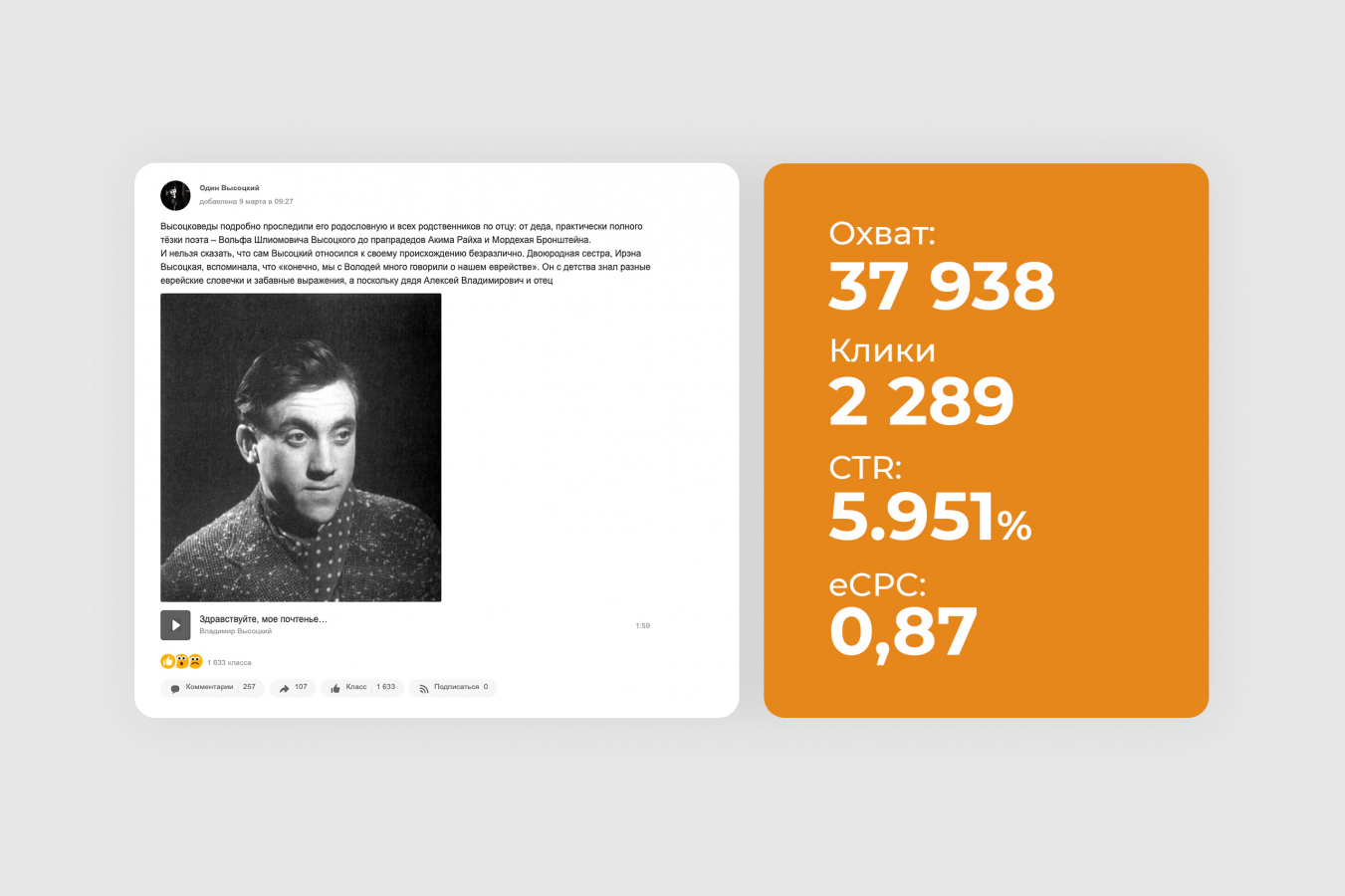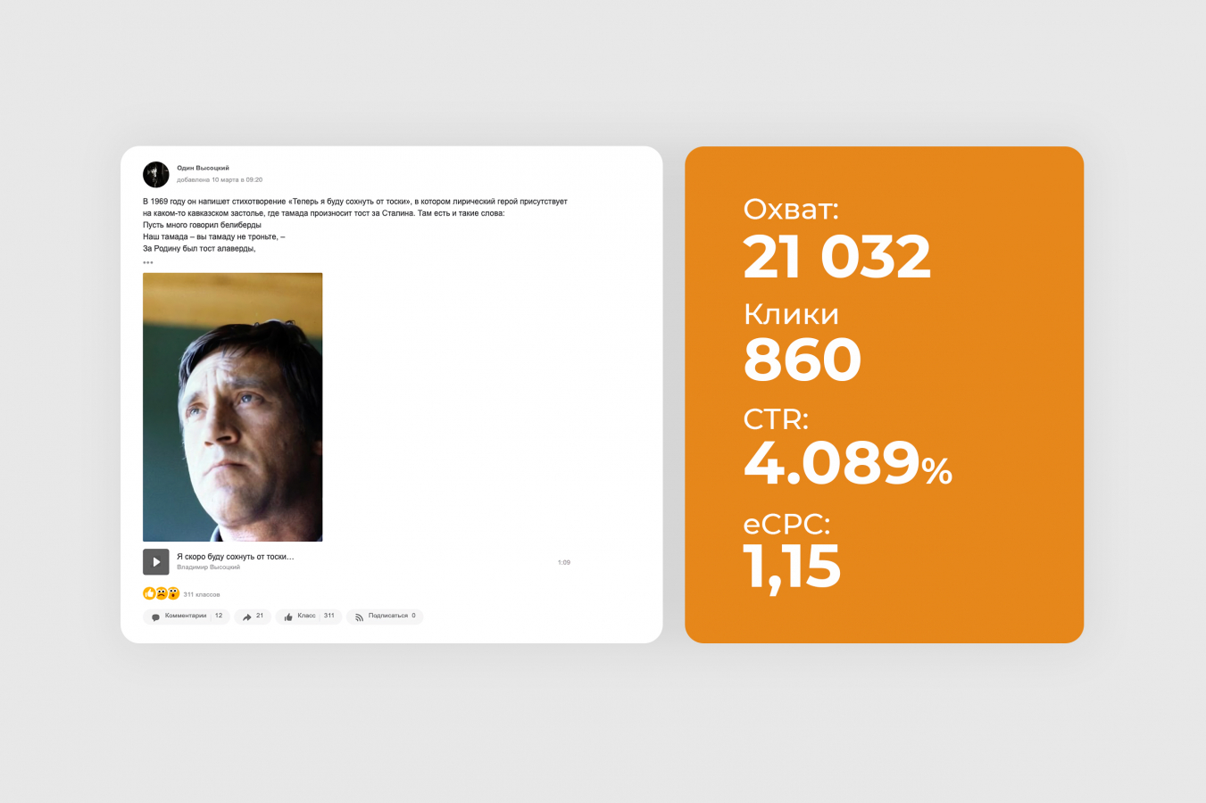 Основатели проекта «Один Высоцкий» считают, что успех рекламной кампании кроется в том, что Рувинский тестировал разную подачу контента. Например, посты о творческом кризисе или вдохновении, любви или грусти собирали наибольший отклик у аудитории. Значит если подавать информацию так, чтобы она «цепляла за живое», то соотношение кликов (CTR) к показам сильно превышает стандартные показатели. Некоторые рекламные посты этой кампании имели CTR от 3% до 6% — они и стали основным драйвером роста группы.