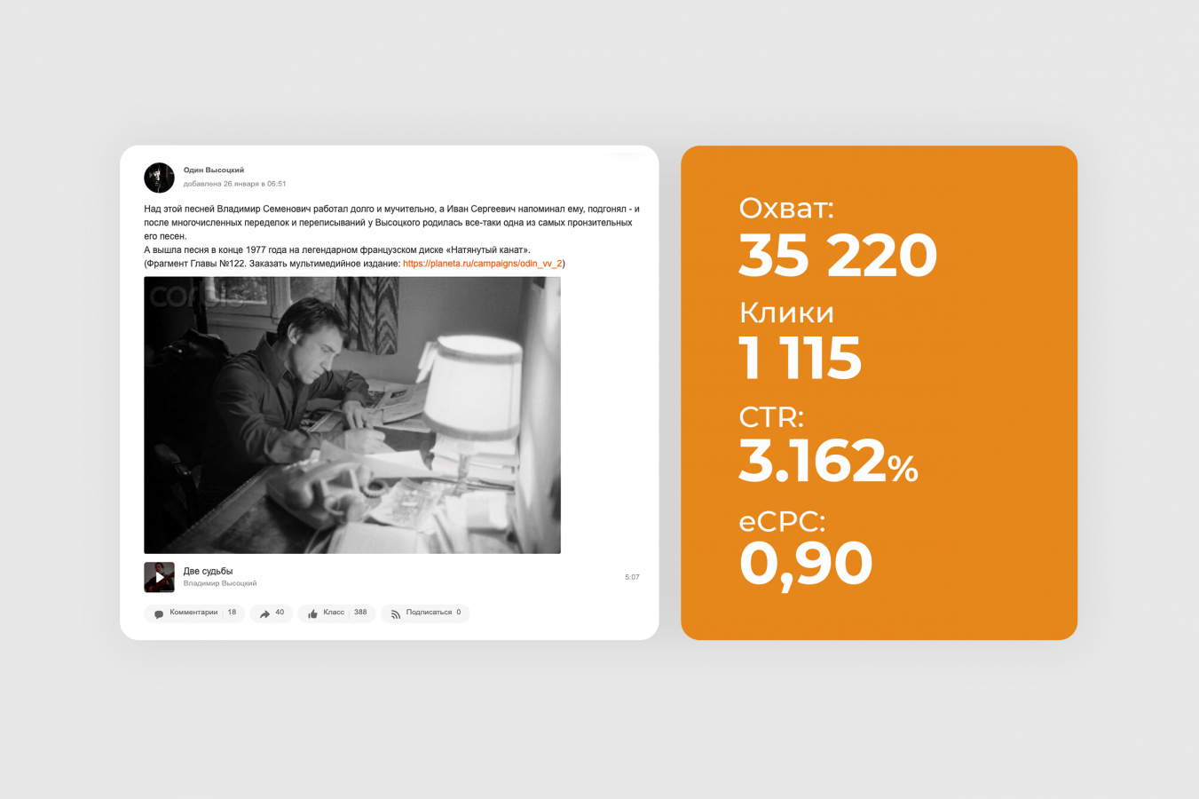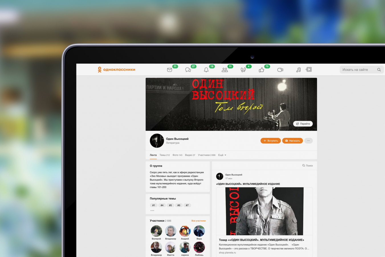 Коллектив программы Антона Ореха «Один Высоцкий» радиостанции «Эхо Москвы» собрал через платформу Planeta.ru средства для выпуска второго мультимедийного одноименного сборника о поэте. Для минимального тиража в тысячу экземпляров требовалось 5,6 млн рублей, однако продвижение в «Одноклассниках» позволило значительно превысить эту сумму. Подробностями реализации с Sostav поделилась команда проекта.