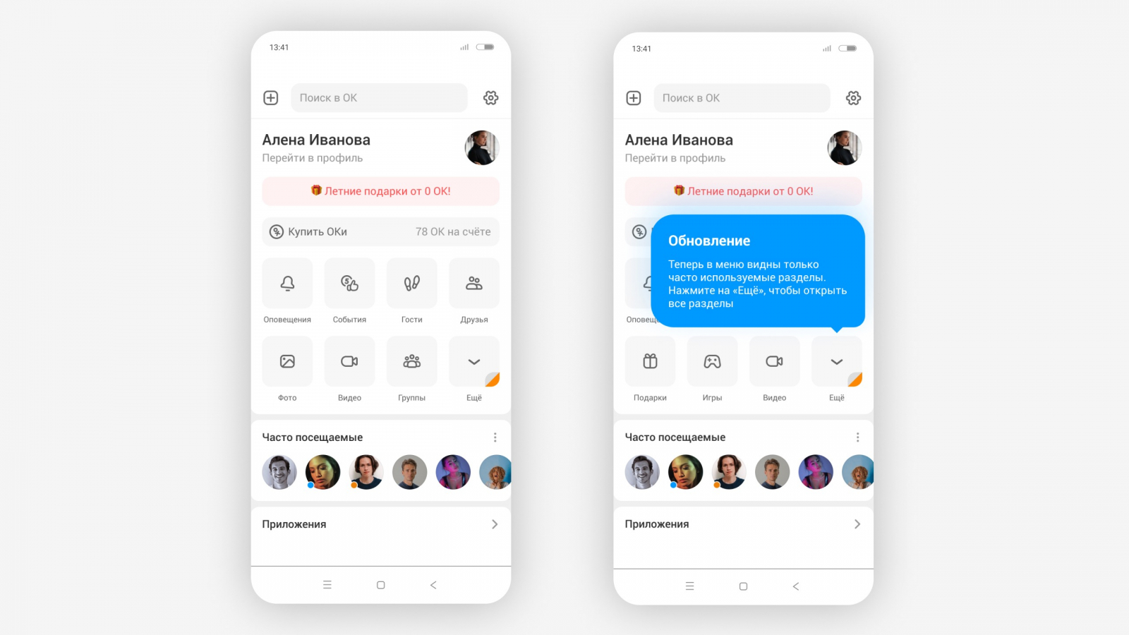 Во второй строке разделы будут адаптированы под предпочтения пользователей и меняться в зависимости от их поведения в соцсети, отметили в ОК. Например, любители музыки и игр получат быстрый доступ к одноимённым разделам, а те, кто часто поздравляет друзей, смогут быстро перейти в раздел «Подарки».