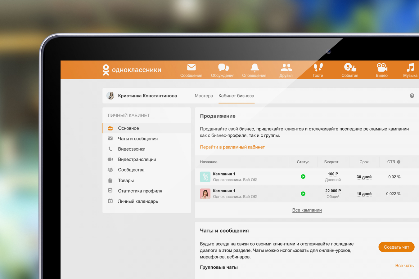 «Кабинет бизнеса» упростит работу предпринимателям и SMM-специалистам, ведущим бизнес и публикующим в «Одноклассниках» профессиональный контент. Через кабинет можно получить доступ к рекламному кабинету, группам, сообщениям, видеозвонкам, трансляциям.