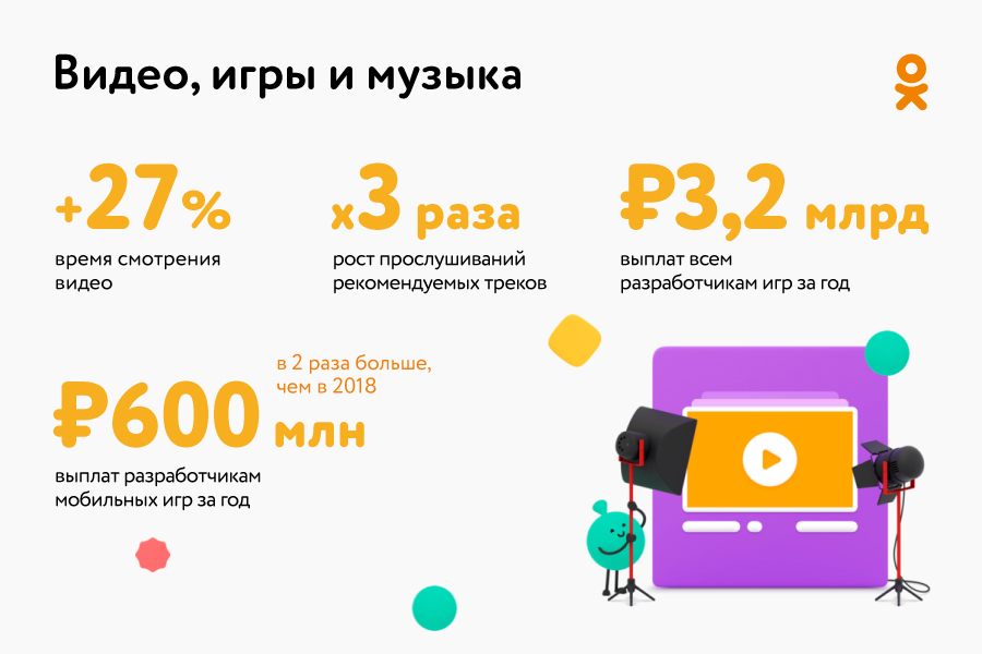 В 2019 году на 27% выросло среднее время просмотра видео в «Одноклассниках». Продолжился рост игровой платформы — в первую очередь на мобильных устройствах. За 2019 год социальная сеть выплатит разработчикам мобильных игр суммарно более 600 миллионов рублей — в 2 раза больше, чем год назад. Суммарно разработчикам на всех платформах соцсети будет выплачено более 3,2 млрд рублей, добавили в компании.