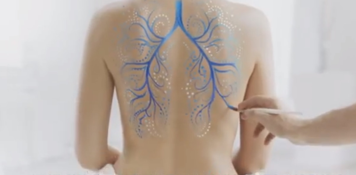 Здоровые легкие прекрасны, а вылечить кашель – целое искусство. Чтобы донести эту мысль в 15-секундном ролике, творческая группа воспользовалась красками и кистью. В качестве полотна – женская спина.