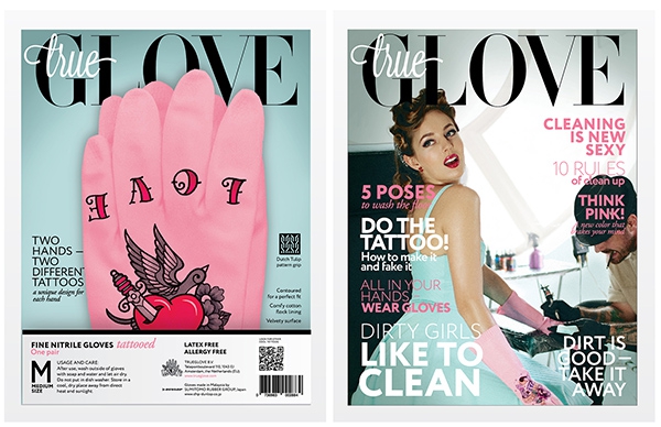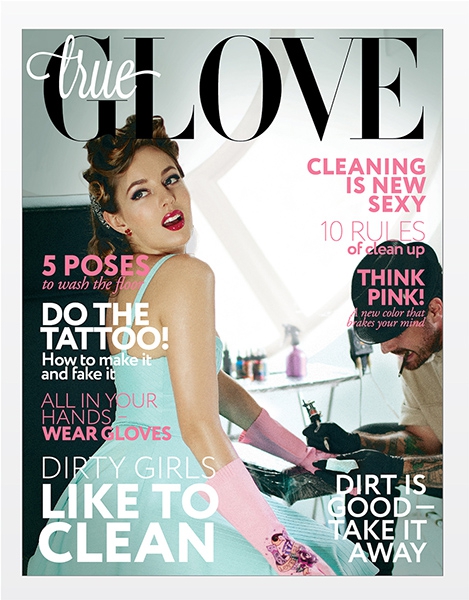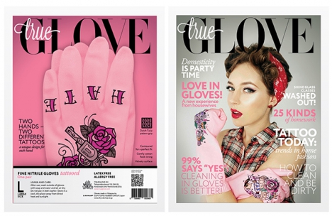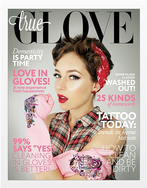 Агентство Ohmybrand разработало дизайн хозяйственных перчаток True Glove с изображением татуировок для дерзких домохозяек, а также упаковку, стилизованную под гламурный журнал.