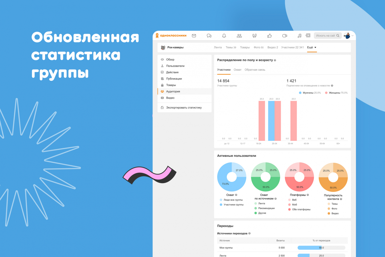 Также «Одноклассники» добавили в статистику групп разделение охватов на источники: «Лента» (охват подписчиков), «Рекомендации» (охват рекомендуемых публикаций) и «Другое» (реклама, «классы» друзей