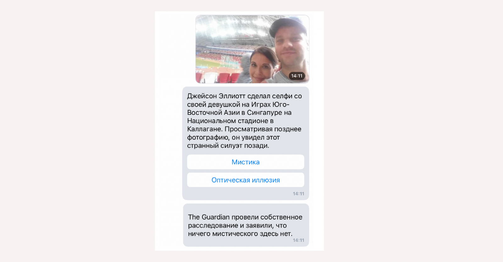 Первая из игр, встроенных в бота, называлась «Иллюзия или мистика». Пользователю по очереди присылались семь сообщений с загадочными фотографиями. Игроку предстояло определить, запечатлено на фото нечто мистическое или же на ней банальная оптическая иллюзия.