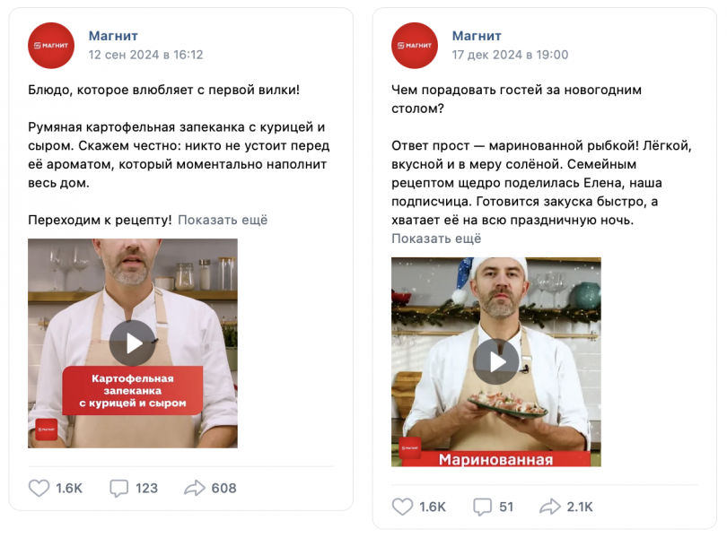 Пост без конкурсов и акций, но получивший много лайков — тоже видео с рецептом, как и у «Пятёрочки». Даже голос девушки за кадром, которая говорит, где она купила товары для рецепта, очень похож. Возможно, это вообще одна и та же девушка.