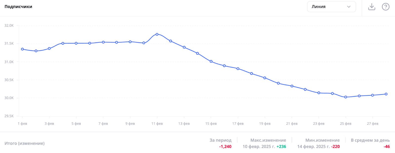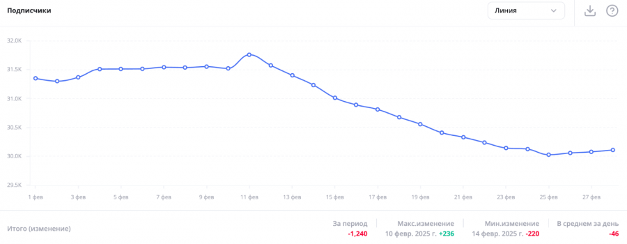 Но вот с эффективностью вопросы. Если посмотреть на график подписчиков этого канала в феврале, то видно, что в даты проведения конкурса (с 23 по 28 февраля) количество подписчиков не возросло, а даже снизилось. То есть метрики есть, а результата нет.