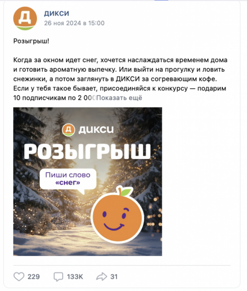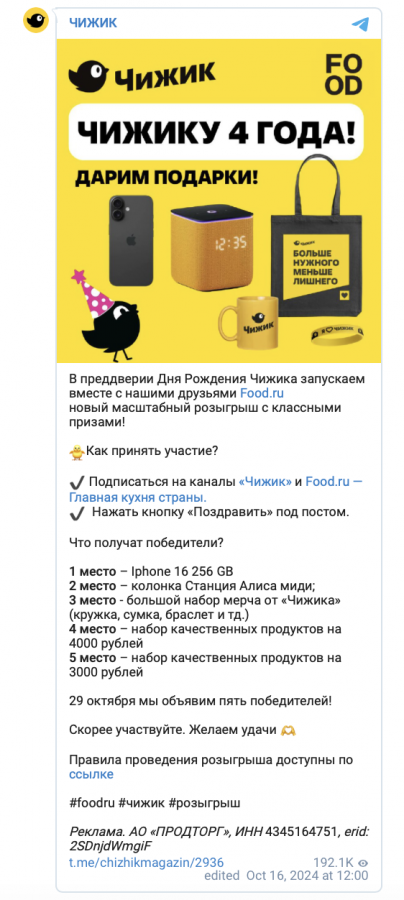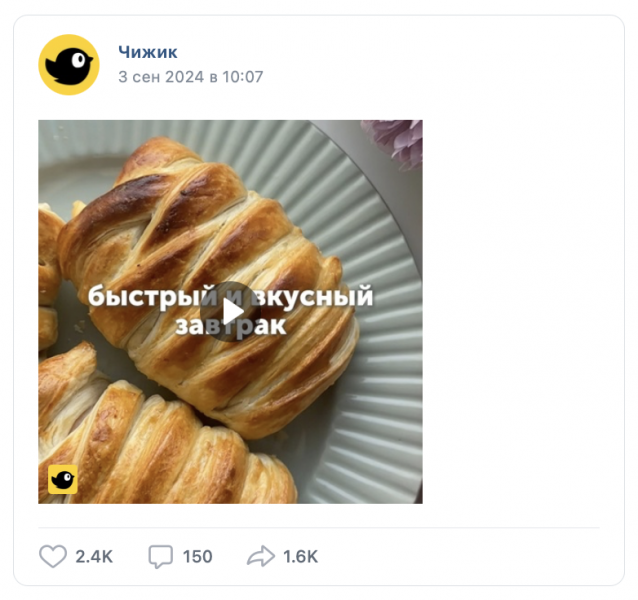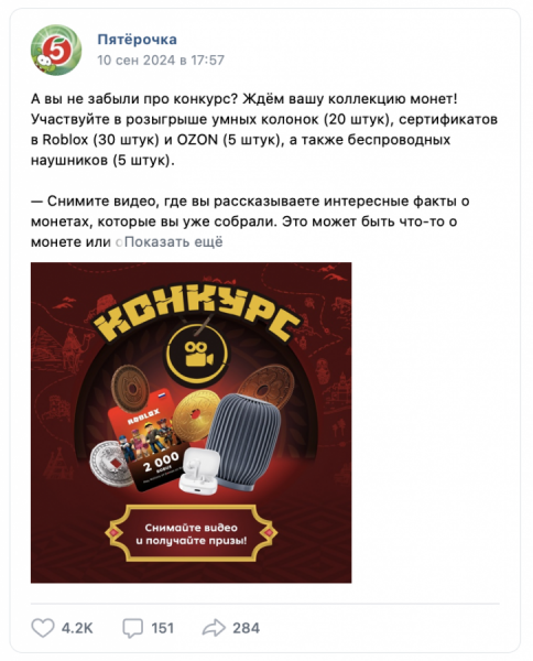 Здесь конкурс хорошо зашел не только из-за призов, но и из-за того, что это коллаб с Food.ru, где 3,9 млн подписчиков. Важно: Food.ru принадлежит тому же X5 Retail, которому принадлежат «Пятёрочка» и «Чижик». То есть он тоже генерирует аудиторию, в конечном итоге для продвижения тех же магазинов. Поэтому это такой коллаб внутри разных подразделений одной большой организации.