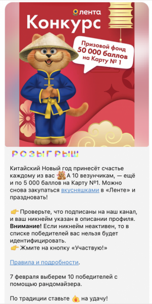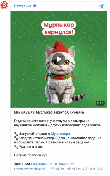 Также хороший отклик получил конкурс с телеграм-ботом, в котором нужно было «гладить» кота и выполнять задания.