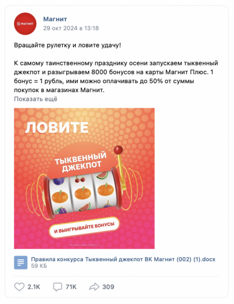 Больше всего комментариев —71 тыс. — собрал конкурс, в котором сработало сочетание простоты условий (нужно было просто написать слово “тыква”) и присутствия бота, который напоминал, что есть еще попытки.