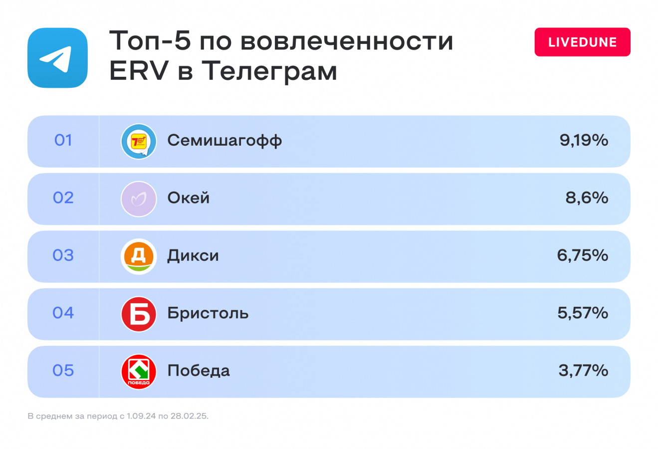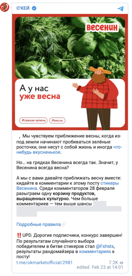 В телеграм-канале этой торговой сети мы впервые в истории наших исследований увидели пост с ERV 2800%. На 6,7 тыс. просмотров оставили почти 200 тыс. комментариев. Какой там пост, про него вообще забыли, все кинулись строчить комментарии ради победы, так как их количество никто не ограничил.