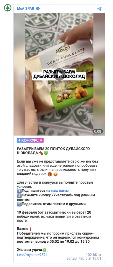 Лучше всего зашел конкурс, где разыгрывали хайповый на тот момент дубайский шоколад. А вот розыгрыш премиум-подписок на «Телеграм» тут зашел сильно хуже, чем у «Пятёрочки» — всего 836 лайков. Но, возможно, его просто не так сильно промотировали.