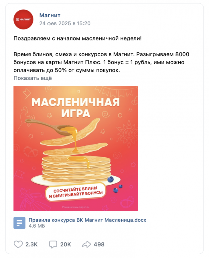 Бюджеты конкурсов, как правило, не очень большие. И собрать десятки тысяч комментариев часто позволяет какой-нибудь символический продуктовый набор. Но даже эти расходы оптимизируют. Например, «Магнит» в качестве призов начал давать бонусные баллы, которыми можно оплатить только 50% стоимости покупки. То есть подразумевается, что победителю конкурса, который обошел десятки тысяч конкурентов, все равно придется платить в магазине.