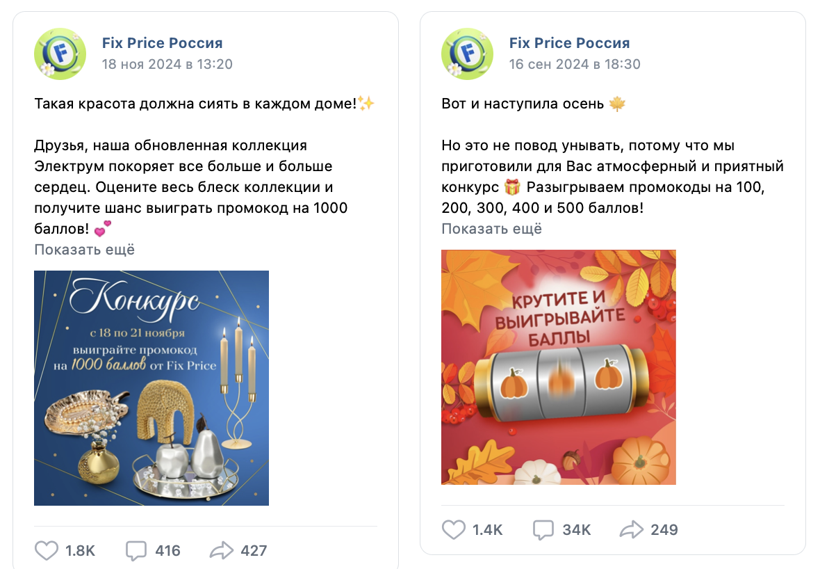 У конкурсных постов просмотры заметно выше, чем у обычных (90−100 тыс. у конкурсов и около 30 тыс. у их результатов), это может говорить о том, что сеть активно вкладывается в их рекламу.