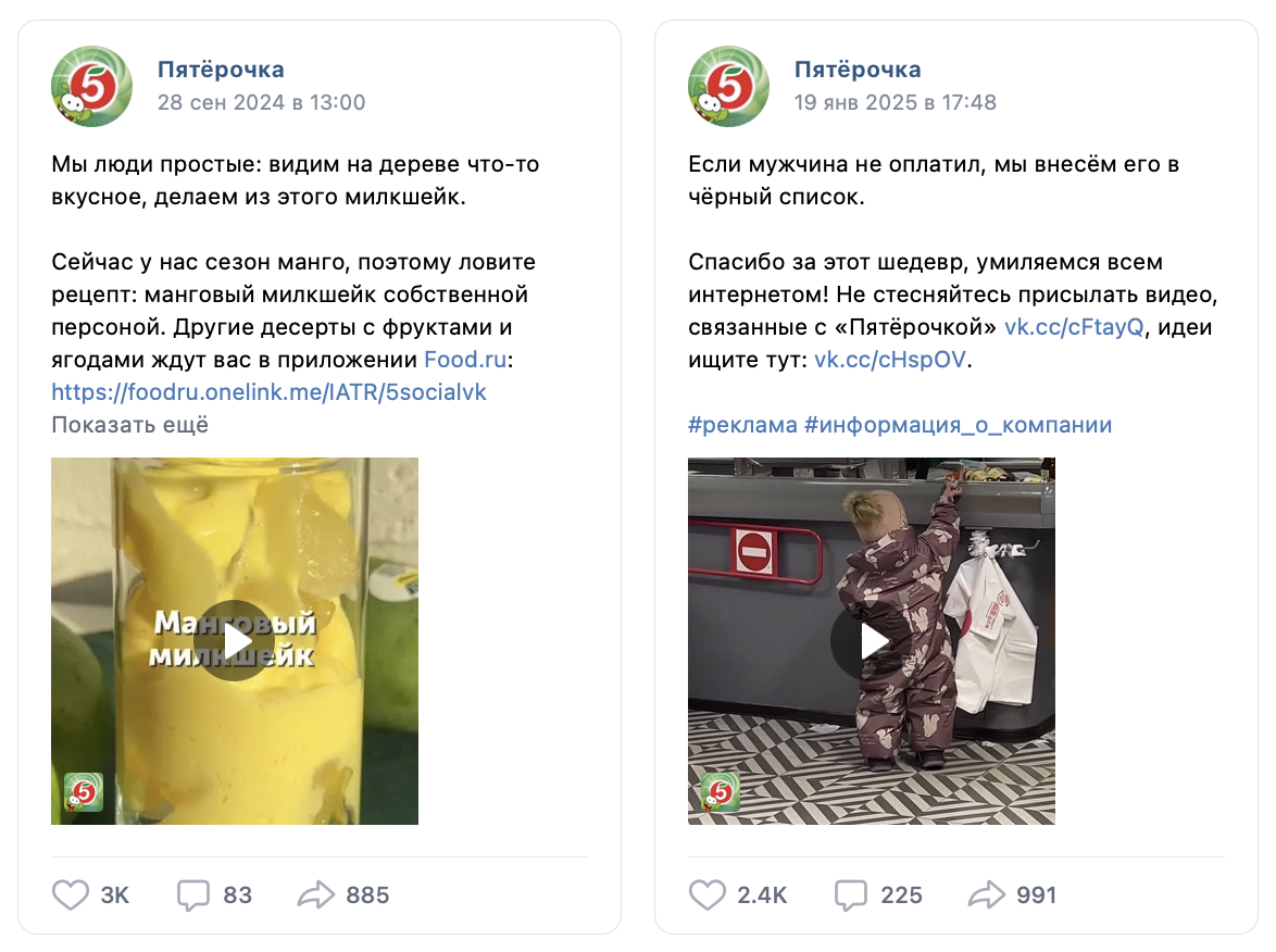 Исключениями (постами, которые попали в топ по лайкам, но при этом не содержали конкурсов и акций) стали два видео. В одном «Пятёрочка» опубликовала рецепт милкшейка из манго.