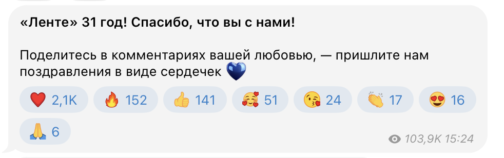 Хорошо зашел обычный текстовый пост о 30-летии «Ленты» с просьбой поздравить лайком. Подписчики хорошо на него отреагировали. Это повод задуматься о том, всегда ли стоит рисовать глянцевые картинки и действительно ли они настолько нужны аудитории «Телеграм».