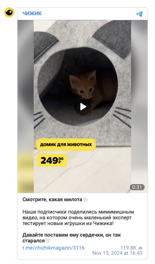 Хорошо зашло мимимишное видео, на котором кот тестирует купленные ему игрушки из магазина. Естественно, сразу с ценой этих игрушек, но это все-таки органичная интеграция.