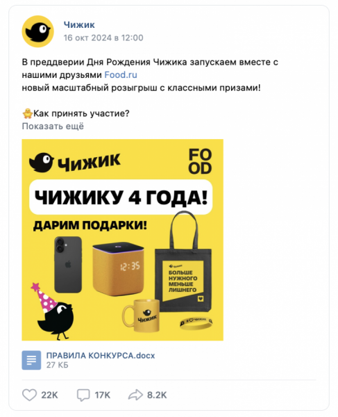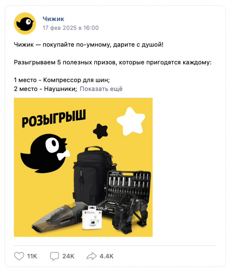 Здесь конкурсов, как и у «Пятёрочки», в топе не очень много. Призовой фонд у набравшего 22 тыс. лайков конкурса интересный, но в целом по затратам плюс-минус, как у Пятерочки. Пятерочка разыгрывала больше колонок, Чижик — одну, но зато главным призом сделала iPhone 16. Также в призах — два набора продуктов (на 4 тыс. и 3 тыс. рублей), сравнимо с 8 тыс. баллами от «Магнита», которые там весь призовой фонд.