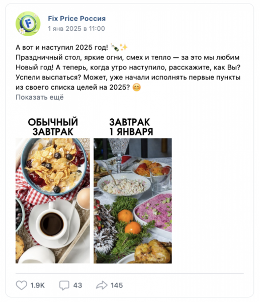 Fix Price — единственный из пяти лидеров по количеству подписчиков, у которого самым залайканным оказался не конкурсный пост, а сообщение про первое января. То есть лайки ставили не ради возможности выиграть какой-нибудь набор крупы, а вполне осознанно. Настолько, насколько слово «осознанно» применимо к утру первого января.