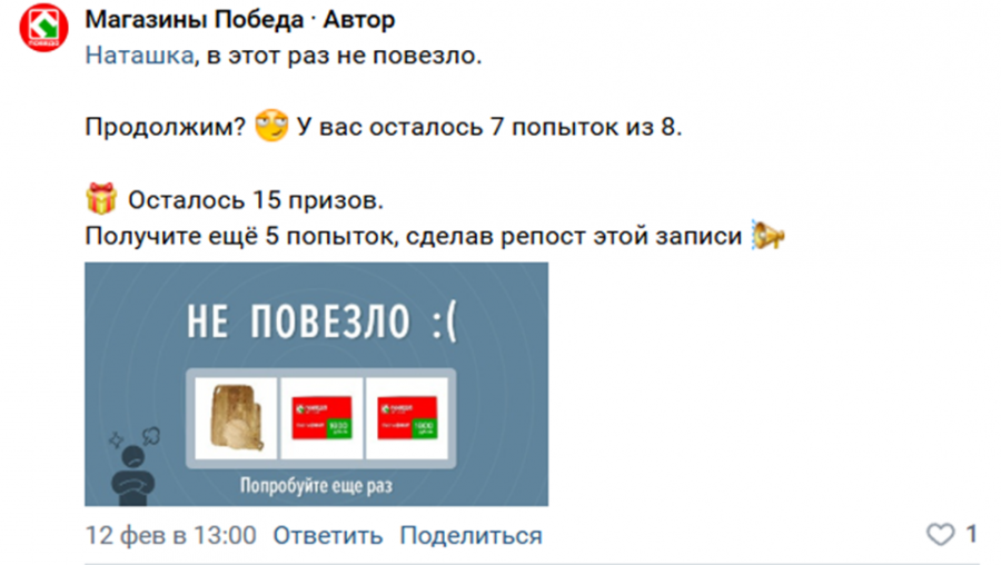 Во втором механика интереснее — нужно было оставлять комментарий, при этом сразу отвечал бот, который писал количество оставшихся попыток и напоминал, что за репост и лайк попыток будет больше.