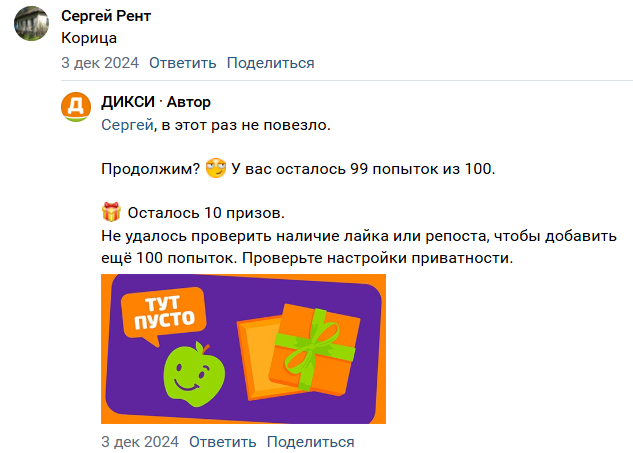 Обычно подписчиков просят оставить комментарий и дожидаться итогов розыгрыша. Но в «Дикси» решили раскрутить своих подписчиков на комментарии по максимуму. Участникам сразу отвечает бот, который напоминает, что у каждого из них есть 100, а то и 200 попыток выиграть приз.