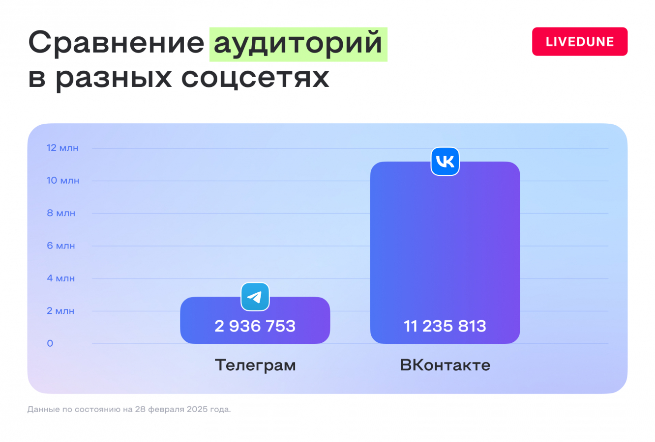 По распределению аудитории мы видим примерно такую же картину, как и в других сферах. Во «ВКонтакте» суммарно подписчиков значительно больше. Что логично, ведь и сообщества там ведутся значительно дольше.