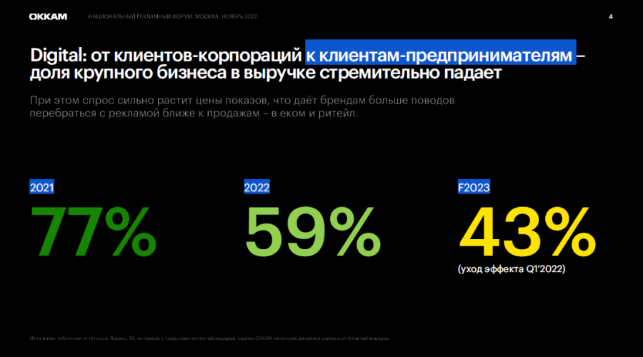 Спикер отметила, что в диджитале «драматически» падает доля крупных рекламодателей. Вместо клиентов-корпораций теперь клиенты-предприниматели. Из-за этого площадкам предстоит адаптировать свой продукт под запросы малого и среднего бизнеса.