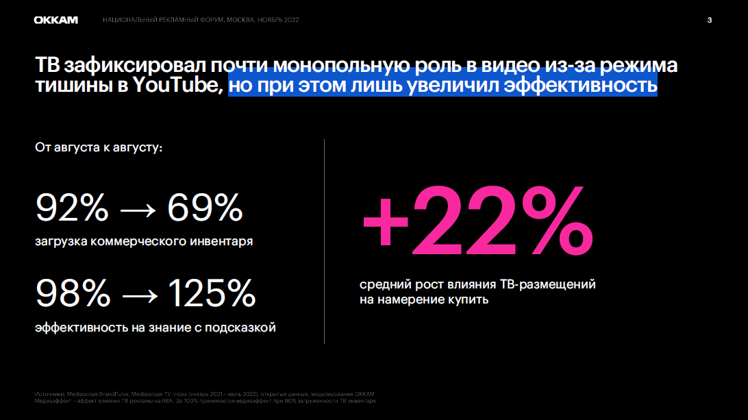 Генеральный директор Okkam (бывшая dentsu Russia) Мария Донских в ходе своего выступления на стратегической сессии «Будущее национальных компаний» в рамках VI Национального рекламного форума (НРФ'6) отметила, что сегмент ТВ зафиксировал почти монопольную роль в видео «из-за режима тишины» в YouTube, но при этом лишь увеличил эффективность.