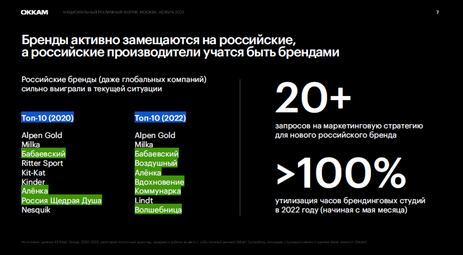 Кроме того, сейчас бренды активно замещаются на российские, а отечественные производители «учатся быть брендами», констатировала глава Okkam: «У нас было более 20 запросов на разработку маркетинговой стратегии для нового российского бренда».