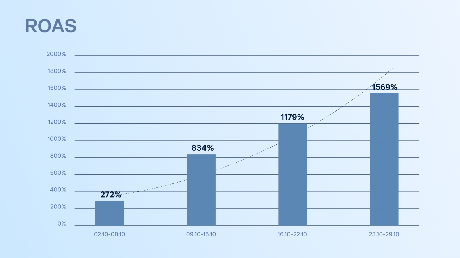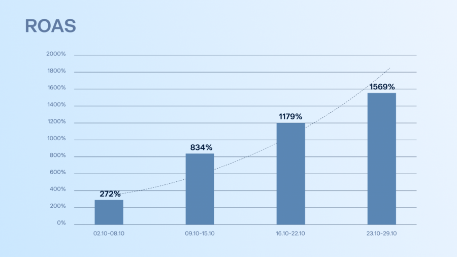 Меньше чем за месяц с момента старта рекламных кампаний ROAS вырос в пять раз — с 272% до 1568% в неделю, выше, чем заявленные клиентом KPI.
