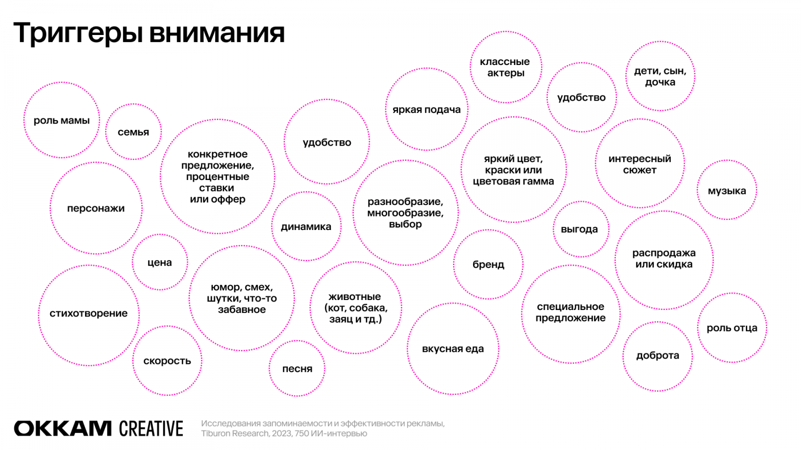 Агентство Okkam Creative и исследовательская компания Tiburon Research провели исследование о вкладе креатива в эффективность рекламы. На основе анализа сотен российских кампаний и более тысячи интервью с потребителями эксперты выявили триггеры внимания — фокусные элементы коммуникации, которые способствуют запоминаемости креатива, и сформулировали шесть характерных для успешного креатива принципов и приёмов. Sostav ознакомился с результатами исследования.