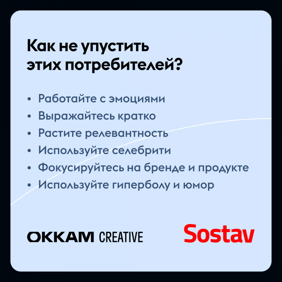В Okkam Creative уверены: успех креативных стратегий кроется в осознанном подходе к процессу создания коммуникации. Важно использовать «триггерное программирование» эффекта на аудиторию. Вот несколько способов, как достучаться до взрослой аудиторной группы в коммуникации: