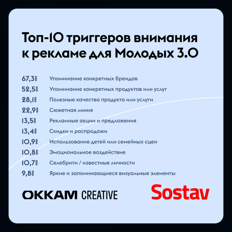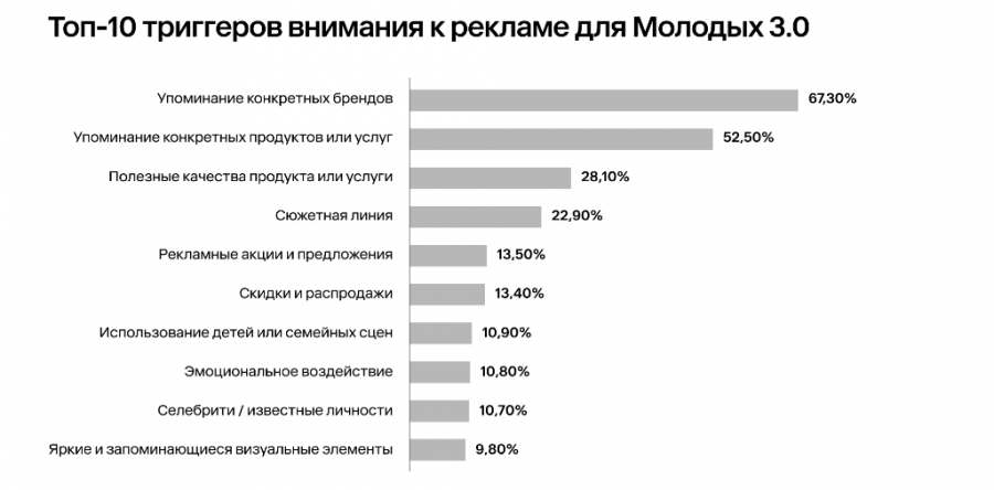По итогу исследования были выведены триггеры внимания — ключевые факторы, которые помогают рекламе понравиться и запомниться аудитории «Молодых 3.0». Первые места в списке по значимости занимают «нерекламные» факторы — бренды, продукты и услуги. Далее следуют триггеры, на которые рекламодатель в силах влиять через креатив в совокупности с маркетингом: коммуникация УТП и пользы, сюжет, акции, скидки, эмоции, яркий визуал и так далее.