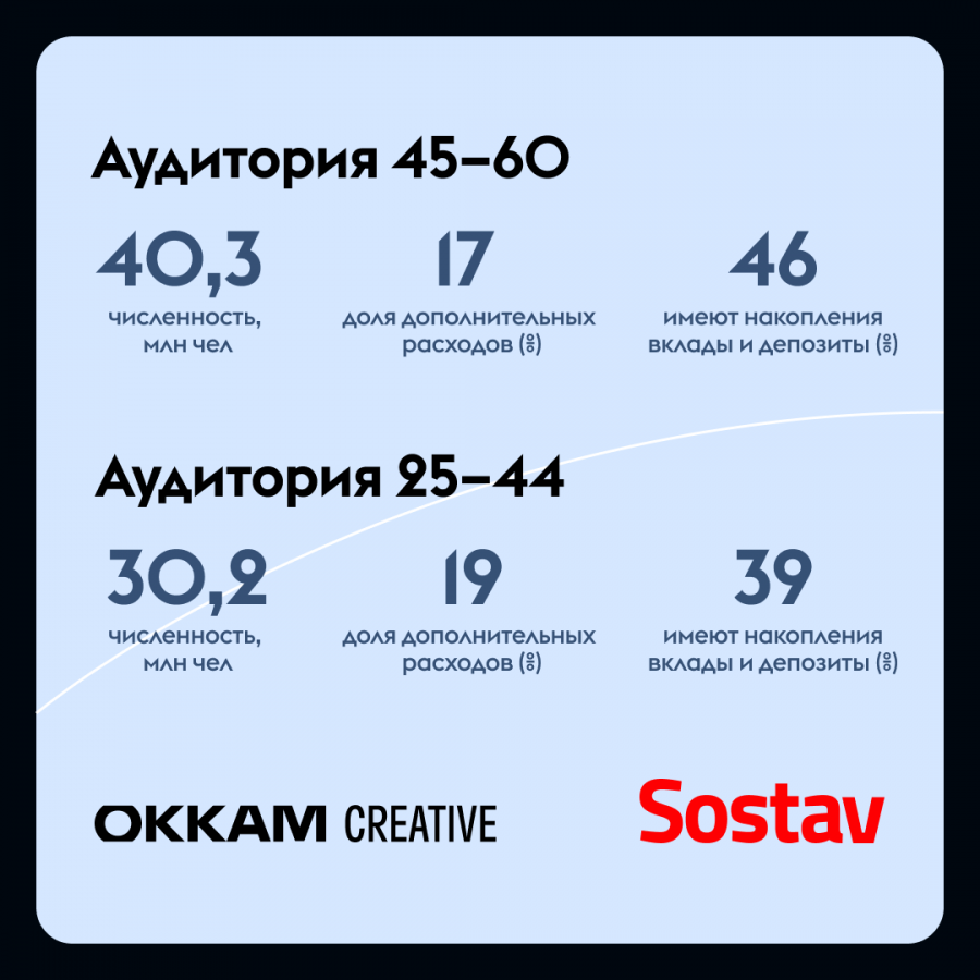 Если посмотреть маркетинговые брифы на разработку рекламных креативов, в половине случаев мы видим фокус на аудитории от 25 до 44 лет. Однако демографическая и экономическая ситуация в стране изменилась: