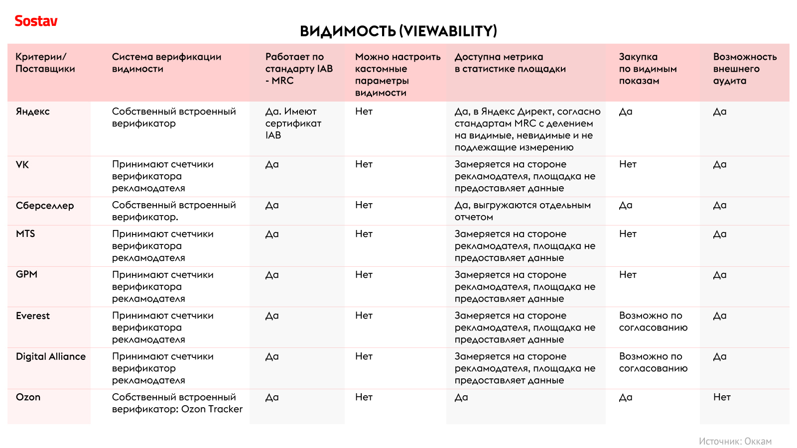 «Яндекс» заведомо продаёт только видимые показы, соответственно, рекламодатель платит только за качественный контакт. «Сберселлер» и Ozon обладают собственными инструментами измерения. Остальные игроки используют данные сторонних верификаторов для аудита. Если необходимо установить более жёсткие требования видимости для оценки качества, это возможно только на стороне внешних систем аудита, таких как Adriver,