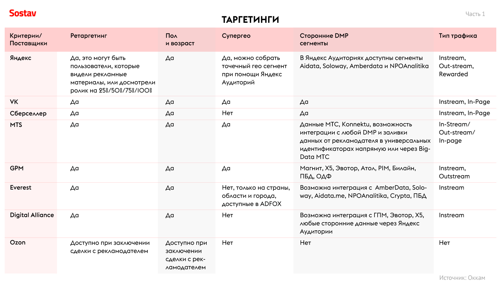 Таргетирование по социально-демографическим характеристикам, CRM, гео- и ретаргетинг — базовый минимум. Они есть в наличии у всех селлеров. Отличительное преимущество — возможность применения различных DMP-сегментов, как собственных, так и сторонних, кастомных сегментов под задачи рекламодателя и таргетирование на аудиторию, которая посещает определённые места.