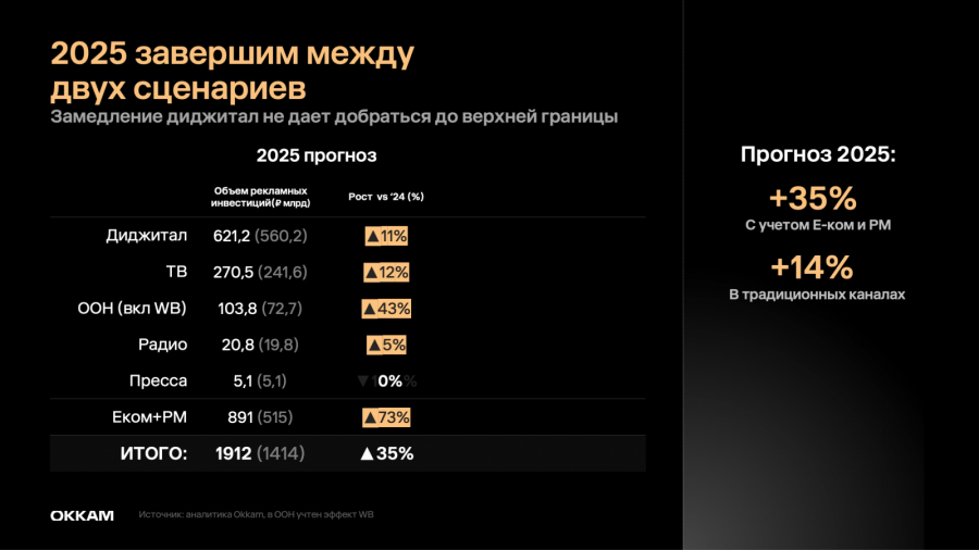 Предыдущий прогноз Okkam был представлен в марте и включал два сценария. Базовый предполагал рост рекламного рынка на 38%, негативный — на 18%. Основная причина, по которой рынок не сможет добраться до верхней границы позитивного сценария — замедление диджитала. Согласно обновленному прогнозу, инвестиции в интернет-рекламу вырастут на 11%, тогда как оптимистичный сценарий предполагал рост сегмента на 17−21%.