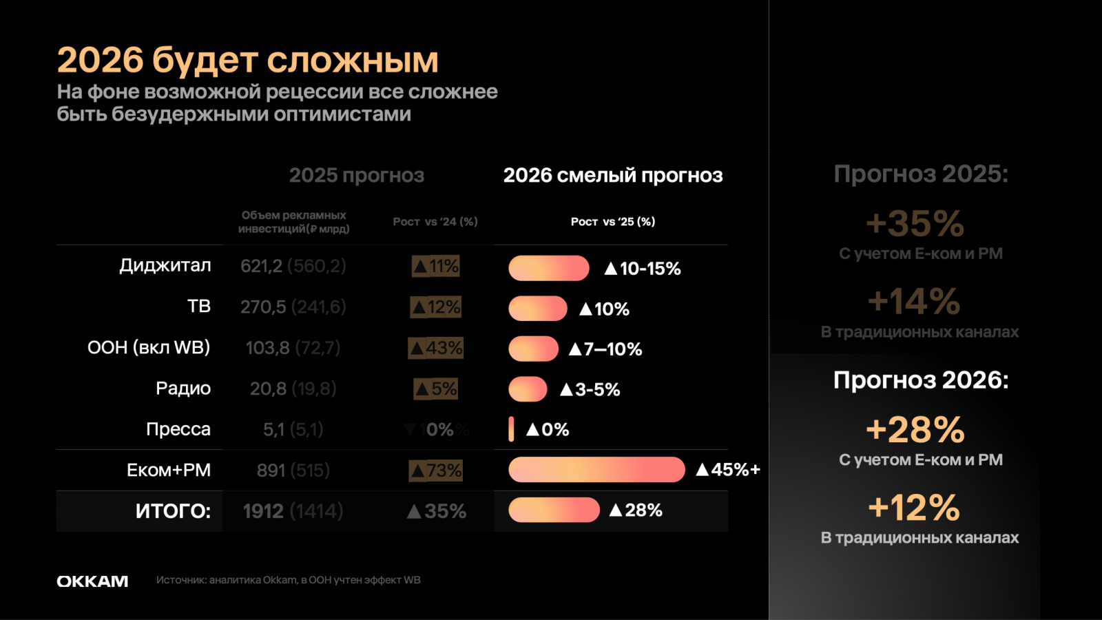 В 2026 году увеличение рынка в целом замедлится до 28% с учетом e-com и retail media. Рост в традиционных каналах составит 12%. Заметное сокращение темпов роста ожидается в сегменте e-com и retail media — до 45%, в OOH — до 7−10%.