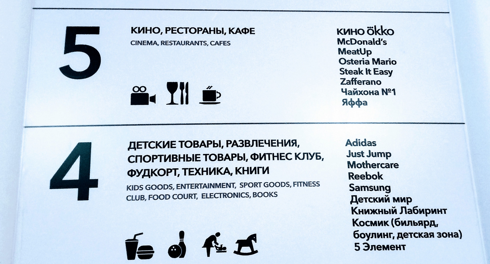 Согласно исследованию Ipsos Flair Russia 2019, крупные торговые центры становятся важным элементом развлечений наряду с театрами и концертами. На смену радости от обладания вещами приходит радость от получения впечатлений, поэтому площади в ТРЦ занимают кинотеатры, детские и спортивные площадки, арт-проекты, VR-игры. Развлекательная составляющая становится все привлекательнее, особенно для семей с маленькими детьми. В итоге ТРЦ превращаются в «однодневные курорты», место, где за короткое время утомленный городской житель может расслабиться и восстановиться.