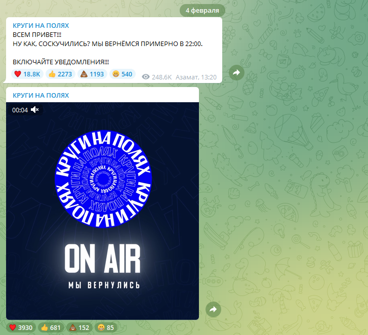 Телеграм-канал «Круги на полях» появился 17 января и менее чем за месяц собрал почти миллион подписчиков. Послушать, как популярные комики Гарик Харламов, Денис Дорохов, Зоя Яровицына, Азамат Мусагалиев, Игорь Джабраилов, Илья Соболев и Михаил Стогниенко говорят на бытовые темы, собралась большая аудитория. Однако 3 февраля сервис Okko организовал для ведущих канала выходной и предложил ознакомиться с киноновинками в кругу семьи. Подробностями и результатами совместного проекта участники поделились с Sostav.