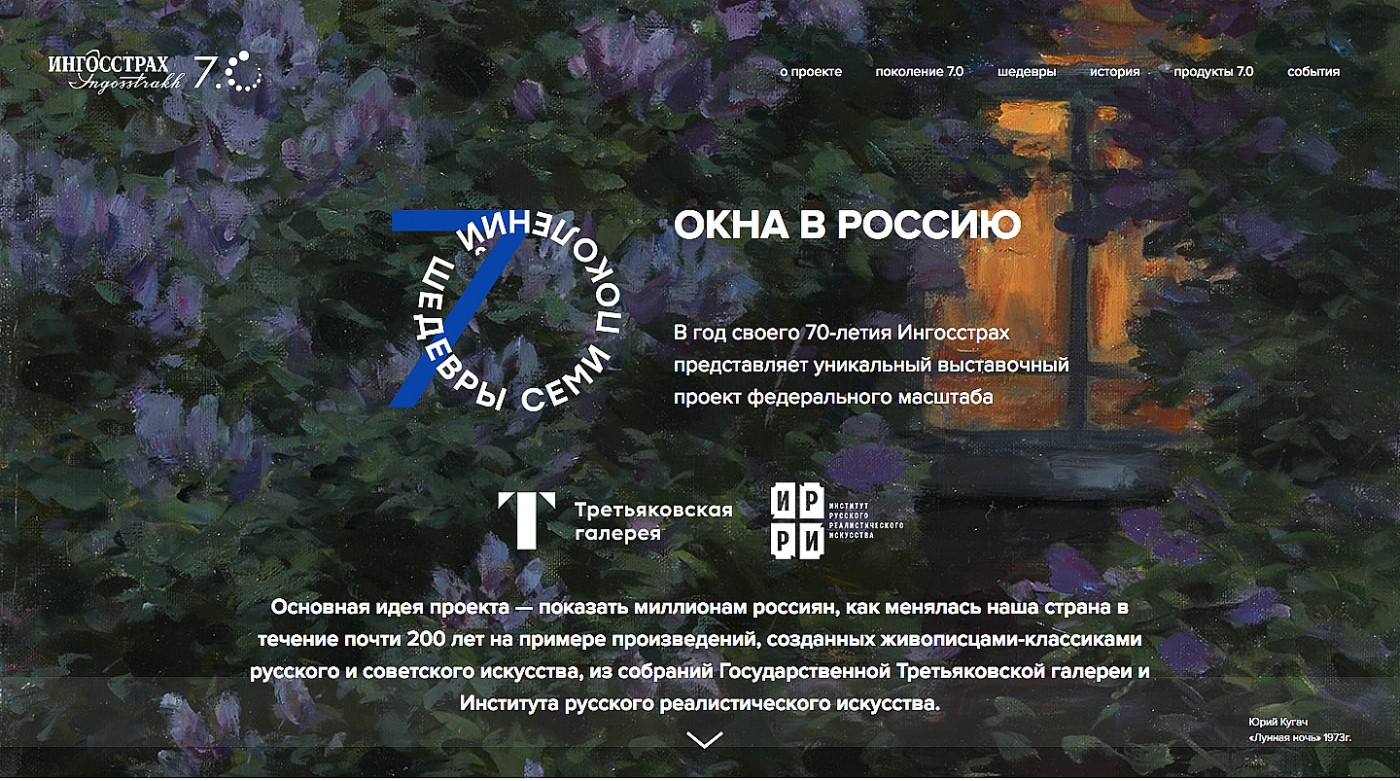 В 2017 году Ингосстраху исполнилось 70 лет. Юбилейный год прошел под слоганом «Страхование в седьмом поколении». В партнерстве с Третьяковской галереей и Институтом русского реалистического искусства «Ингосстрах» организовал уникальный выставочный проект «Окна в Россию. Шедевры семи поколений», который стартовал в июле 2017 г. в Калининграде и завершился в январе 2018 г. экспозицией во Владивостоке. Знаменитые полотна мэтров русской живописи на выставках, мультимедийных спектаклях и гала-вечерах увидели более 100 тысяч посетителей по всей стране.
