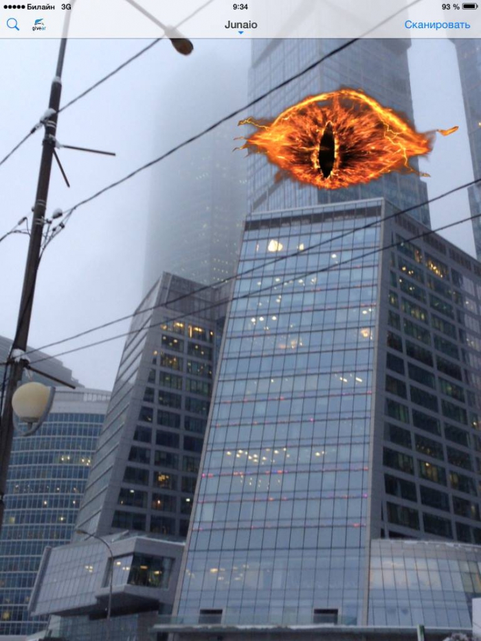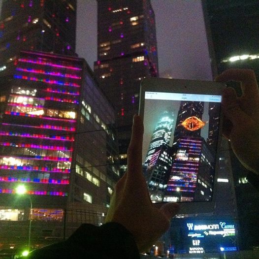 Компания GiveAR решила зажечь «Око Саурона» над «Москва-сити» и запустила проект дополненной реальности. Жители столицы могли увидеть символ зла с помощью смартфона или планшета. Если установить приложение Junaio (мобильный браузер дополненной реальности), отсканировать QR-код и навести устройство на высотку, то на крыше появится картинка из Мордора.