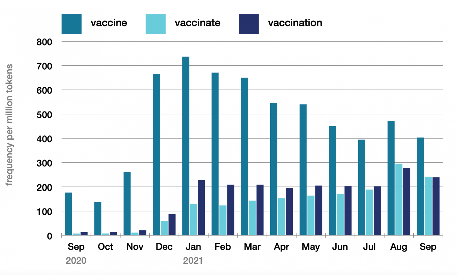 В ходе массовой прививочной кампании по всему миру образовались неологизмы «вакциниста» (vaxinista), «вакси» (vaxxie), «ваксатон» (vax-a-thon). Первым словом иронично называют человека, который привился от коронавируса и демонстрирует это в соцсетях. Иногда им называют учёных и врачей, которые разрабатывают или вводят вакцину. Вторым — селфи, сделанное во время вакцинации. Третьим — мероприятие, во время которого люди массово прививаются, в том числе от COVID-19.