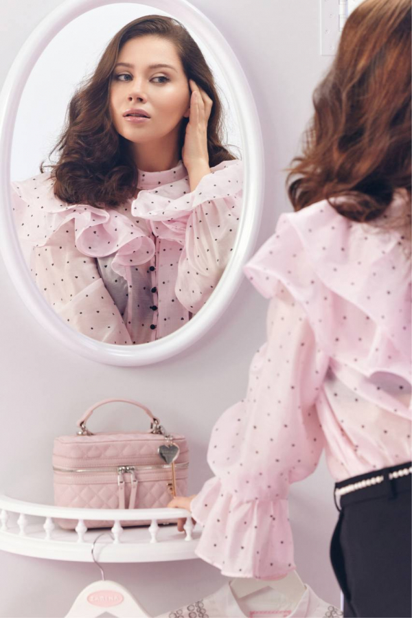 Ключевой мотив весенней коллекции — polka dot. Линейка включает жакет с перьями, брюки-кюлоты, платья, юбки и блузки в горох, твидовый костюм в стиле 60-х, пальто, сумки, украшения и другое.