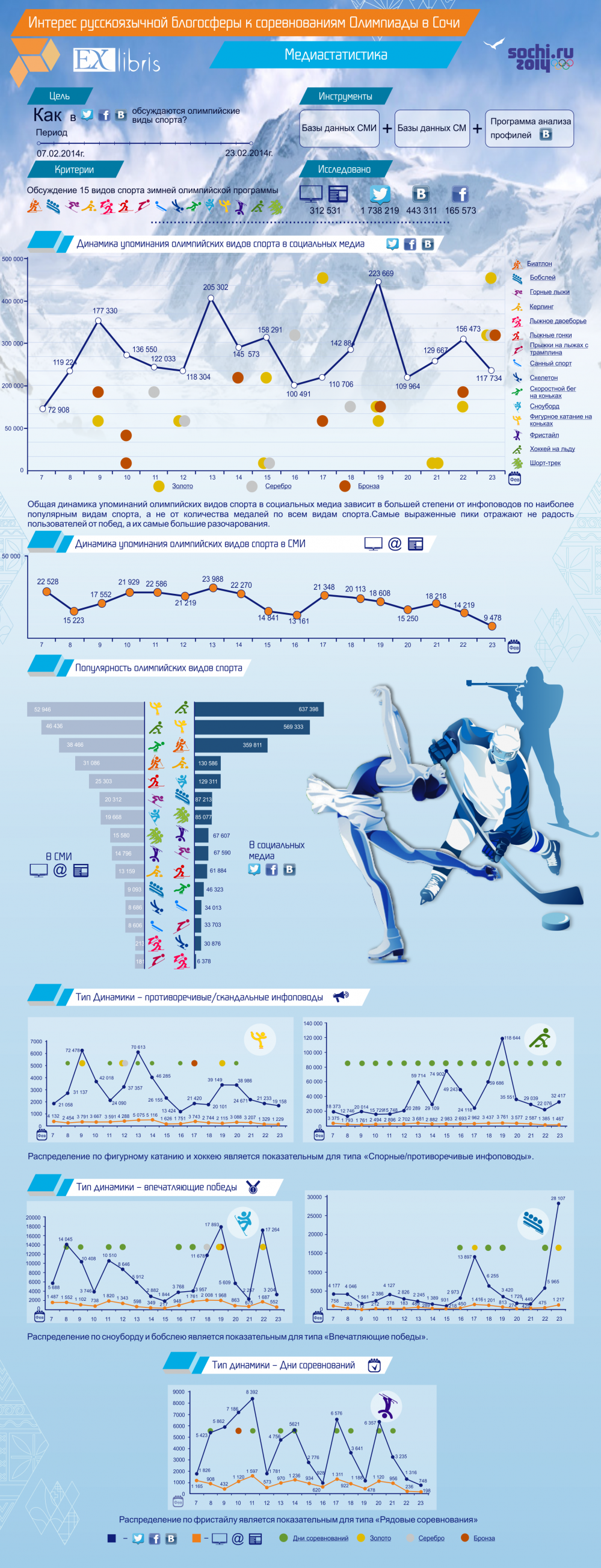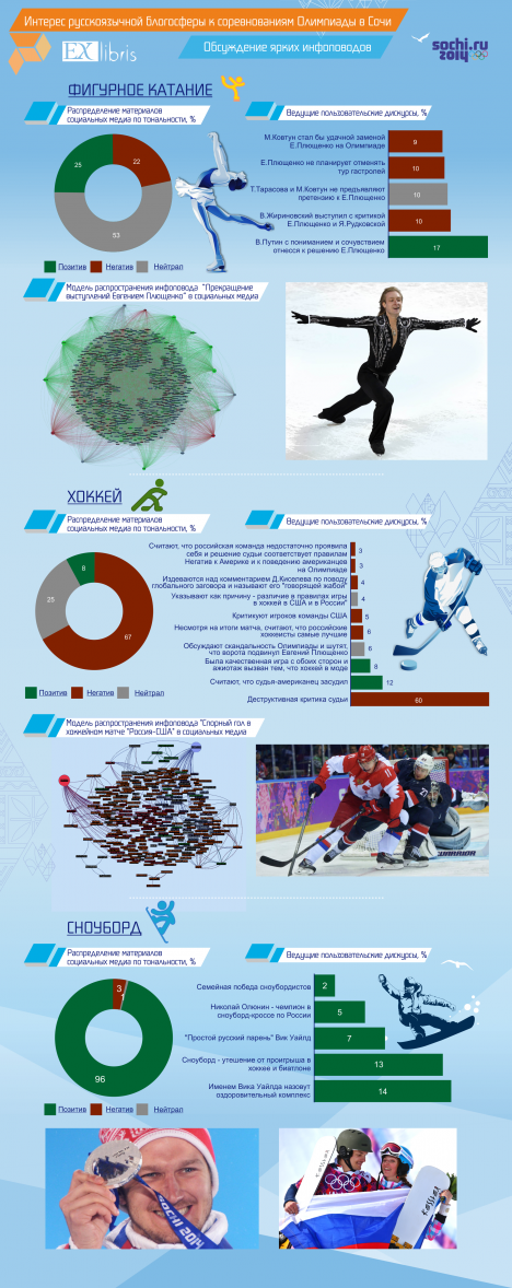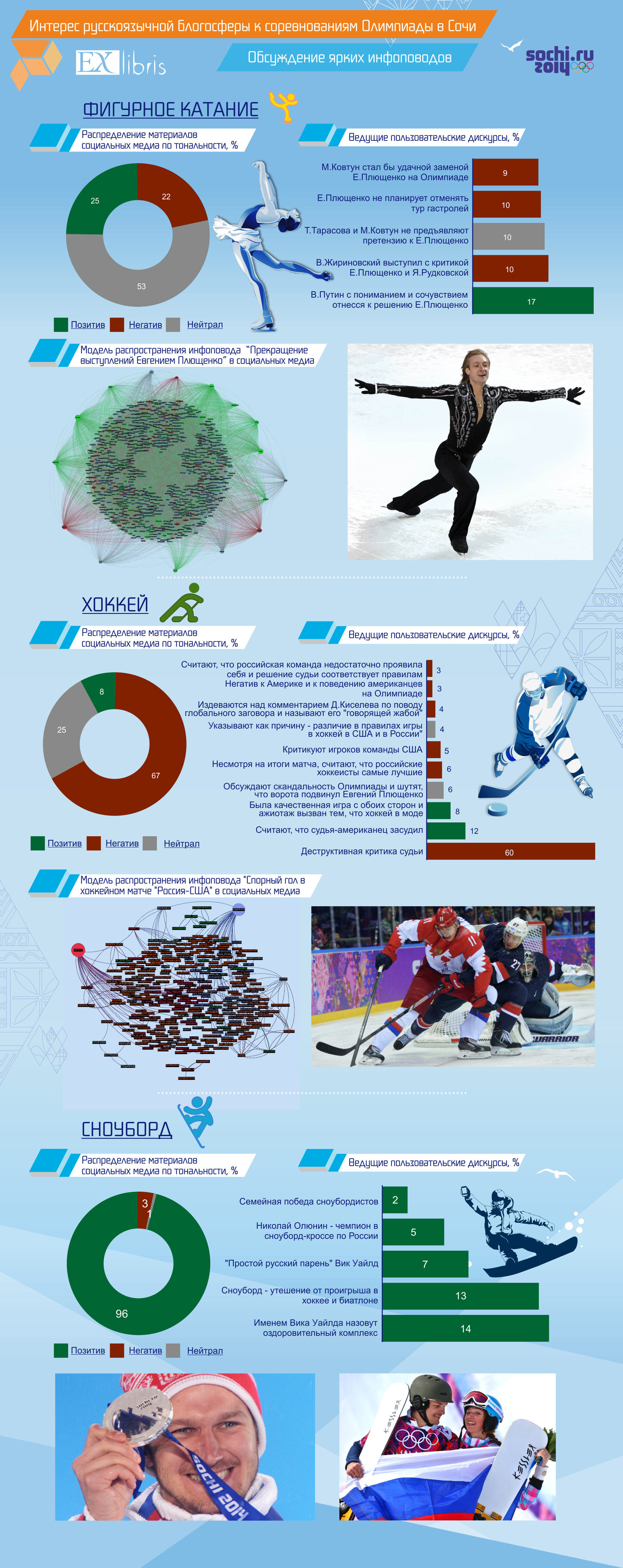 Согласно исследованию агентства Ex Libris, наиболее заметные пики в динамике упоминаний олимпийских видов спорта отражают самые большие разочарования болельщиков. Например, отказ Евгения Плющенко от продолжения выступлений и проигрыш российской хоккейной сборной финнам вызвали большую волну, чем победы наших олимпийцев.