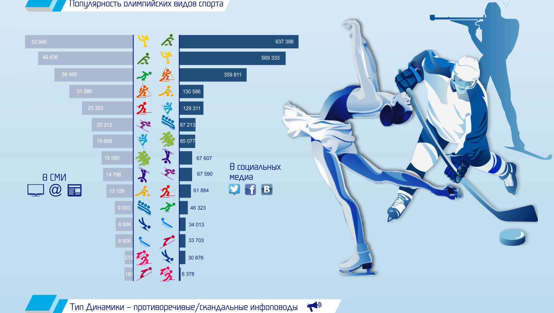 Анализ медиаполя олимпийских соревнований показал тесную зависимость динамики упоминаемости зимних видов спорта от наиболее спорных и дискуссионных инфоповодов. Данным темам свойственно переходить из режима спортивного обсуждения в режим общественно-политической дискуссии. Это объясняется тем, что хоккей и фигурное катание крайне популярны у россиян, здесь поражения или форс-мажоры воспринимаются как уязвленная национальная гордость.