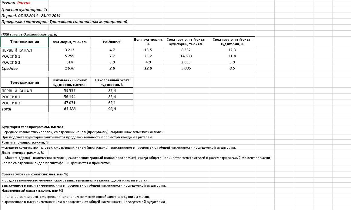 По данным TNS, трансляции с Олимпиады в среднем собирали 12,8% телевизионной аудитории 4+ на «Первом канале», «России 1» и «России 2». Наибольшее число зрителей привлек канал «Россия 1» – 23,2% аудитории. На втором месте «Первый канал» с долей 18,5%, за ним следует «Россия 2» с долей 4,9%.
