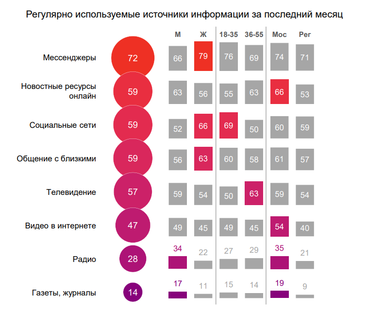 Мессенджеры — главный источник информации, отметили 72% опрошенных. Это происходит, поскольку они совмещают в себе как живое общение с близкими, от которых регулярно получают информацию, так и некоторое подобие соцсети — прежде всего в формате Telegram.
