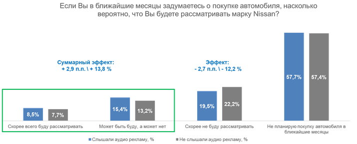 Пользователи, которые слышали аудиорекламу, выражают большее намерение приобрести продукт, чем пользователи, которые не слышали рекламу. Снизилась доля отрицательных ответов, что позволило вырасти доле положительных.